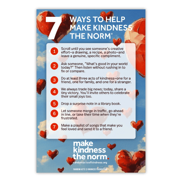 Download our premade profile & post images for Facebook, Instagram, LinkedIn, Tiktok, X / Twitter and YouTube. We also have a fun image you can post that shows 7 ways to make kindness the norm during Random Acts of Kindness Week & Random Acts of Kindness Day®.