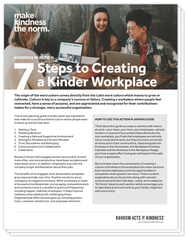This Kindness in the Workplace action planning guide includes seven key ingredients that make for a positive and kind culture where people want to show up and do their best: