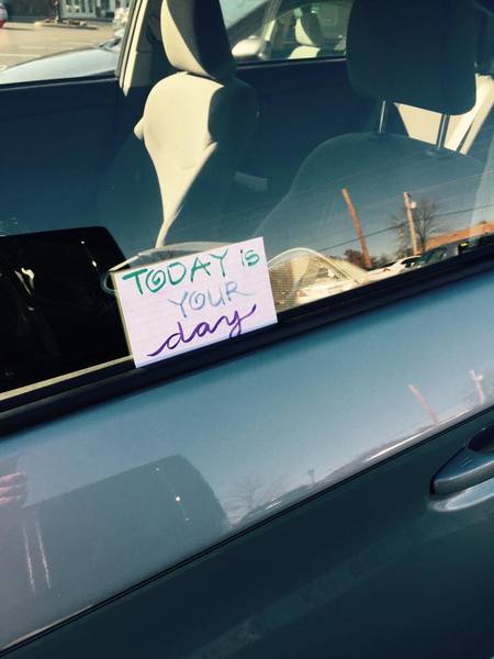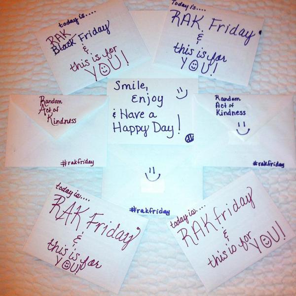 - Place $5 in an envelope. Randomly hand it to someone and include a note inside that says, “Happy #RAKFriday! Use this $5 for yourself or, pass it on as an act of kindness for someone else”