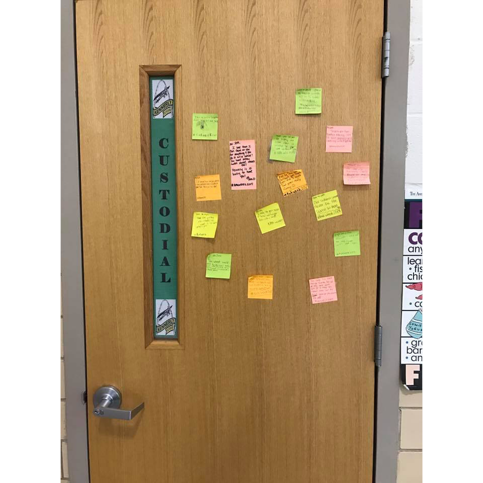5th graders are Kennerly Elementary thank their custodian by decorating his door with kind notes