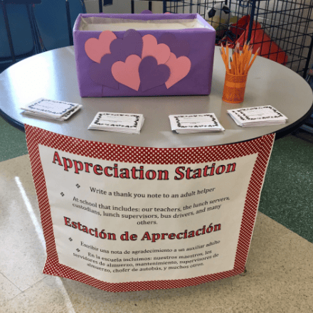 An appreciation station is set up at Rupley Elementary for students to thank all the adult helpers at their school